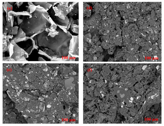 SEM micrographs of (a) raw cork (RAC), (b) RAC after washing, (c) regranulated cork (RGC, (d) graphite (Gr), (e) GrRAC, and (f) GrRGC, using a magnification of 1500×.