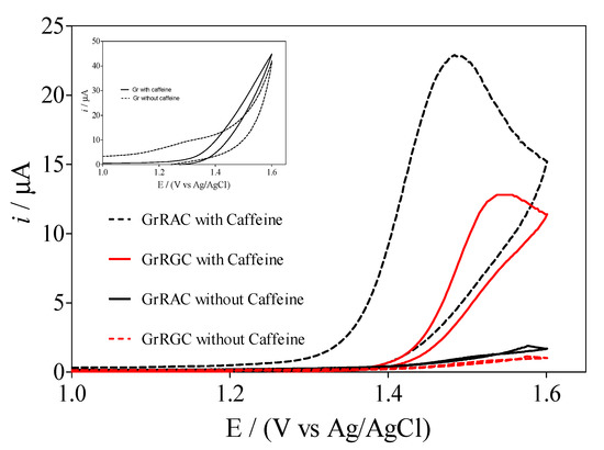 Cyclic voltammograms recorded at GrRAC and GrRGC electrodes in absence and presence of caffeine (0.01 M) in 0.5 M H2SO4 at 100 mV s−1. Inset: Gr electrode, in absence and presence of caffeine (0.01 M).