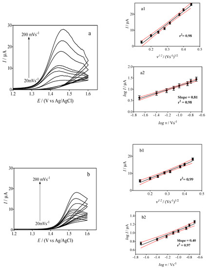 The effect of scan rate (20 to 200 mV s−1) on the electrochemical behavior of caffeine was investigated using GrRAC and GrRGC sensors (Figure 4). As shown in Figure 4a,b, an increase in peak current was recorded for both sensors when the scan rate was increased. The peak current was determined by the NOVA Software system, properly extrapolating the baseline for peak current measurement [37]. Furthermore, an analysis of the relationships between the peak current versus the square root of the scan rate (I vs. υ1/2), and the logarithm of the peak current versus the logarithm of the scan rate (logI vs. logυ) allowed to understand mass transport behaviors. The results showed a modest linearity of I vs. υ1/2 (insets a1 and b1 in Figure 4), indicating that the mass transport of caffeine towards the electrode surface occurred through a diffusion process. By plotting the log I vs. log υ, slopes of about 0.81 and 0.39 were obtained, for GrRAC and GrRGC, respectively (insets a2 and b2 in Figure 4). A visual verification of the absence of a significant non linearity was done by including the regression curve residuals (insets in Figure 4), as strongly suggested by IUPAC [38,39] and already recognized by specialists in the field [40,41]. Furthermore, it is important to indicate that slopes around the theoretical value of 0.5 indicate that the system is mainly controlled by diffusion [5], as observed for GrRGC. However, in the case of the GrRAC sensor, the higher slope value obtained (≈0.81) could be associated with adsorption-diffusion processes. The linear regression equation could be expressed as follows: