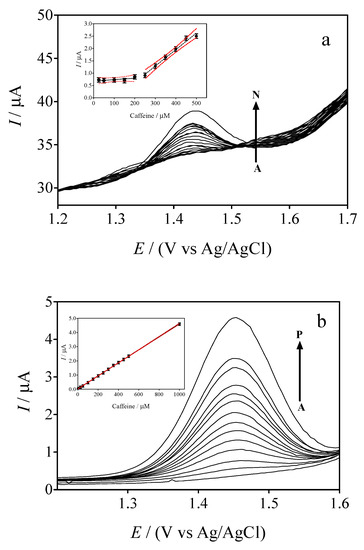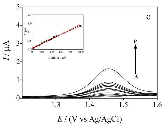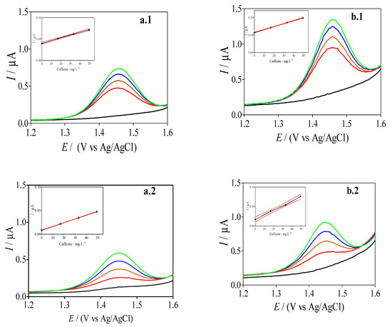 In order to evaluate the applicability and practical feasibility of the sensors proposed, beverages and pharmaceutical formulations were analyzed. Using a mortar, ten pharmaceutical tablets containing 65 and 30 mg of caffeine were carefully ground into a fine powder. Subsequently, an amount of powder equivalent to the average weight per tablet, was dissolved in 30 mL of ultrapure water by sonication for 5 min. The sample was centrifuged for 5 min (at 4000 rpm) and diluted 1:4 (v/v) in 0.5 M H2SO4 [31], adding the appropriate amount to the supporting electrolyte in the voltammetric cell. Ultrasonication (10 min) was used to degas the soft and energy drinks, which were then transferred to the voltammetric cell with the supporting electrolyte to proceed with the determination of the caffeine. The standard addition method was used to quantify caffeine in the samples [32]. All experiments were carried out in triplicate, and mean values (standard deviation < 5%) were used for the figures.