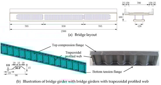 The construction of the plate girders with trapezoidal profiled web in bridge application has been gathering momentum in recent decades. For example, more than 30 such bridges have been constructed during the period from 2005 to 2013 in China. It has been regarded as an effective improvement of shear capacity in comparison with conventional concrete girders and classical composite girders when their corresponding concrete webs and stiffeners have been replaced by the trapezoidal profiled webs. Moreover, since the effectiveness of prestressing has been improved by the accordion effect of the trapezoidal profiled webs, considerable resistance can be achieved especially for prestressed composite girders []. The webs are normally designed with the height ranging from 333 to 1500 mm and corrugation amplitude of 40 mm []. For weight saving, thin-walled plates with sufficient local and global shear stability as required by design codes are often considered for trapezoidal webs. In the design code of EN 1993-1-5 [], the supports of web panels are pinned at the edges joining flanges and stiffeners whose torsional stiffness are low. The flange of the concrete slab is beneficial due to the increase in global buckling resistance and extending the linear elastic range of load versus deflection relation. In contrast to conventional prestressed concrete or steel plain web girders, the bridge girders with trapezoidal profiled webs also exhibit a different seismic response due to different torsional and flexural properties of the webs. As outlined in Zhang et al. [], the seismic waves induced axial forces and bending moment around transverse direction of the trapezoidal profiled web are greater, while the bending moment along the longitudinal direction and the decaying speed of acceleration are less than those of the conventional bridges. Additionally, the combination with stiffer flanges, e.g., concrete filled tubes to increase shear strength [], and with the use of high strength steel [] to increase flexural strength, has received more attention by contemporary researchers. Most of those bridges (such as a report in Li et al. []) were designed with sufficient shear strength so that the girder resistance is determined by flexural behaviour. An analytical example is a single-span bridge from the support centre lines as shown in Figure 1a. The carriageway is 25 m long and 7 m wide with a 1.5 m footway on either side. The flange steel plates welded at upper and lower end portions of the trapezoidal profiled web are connected to the concrete slab using mechanical shear connectors. For the sake of simplicity in analysis, the steel parts of the bridge girder are isolated consisting of 50 cm wide flange plates and a 160 cm height web with a span of 25 m. The trapezoidal profiled web is 9 mm thick, consisting of a 25 cm wide longitudinal fold and inclined fold, while the wavelength is 90 cm along with web corrugation angle θc = 36.8°, as shown in Figure 1b. The corresponding web height-thickness ratio is 17.78. All configuration and geometric details of the main girder as well as related vehicle moving loads were accounted in the dynamic analysis of this study. The finite element model has been developed using ANSYS 15.0 software (ANSYS Inc. Canonsburg, WA, USA). Please consider this suggested change.