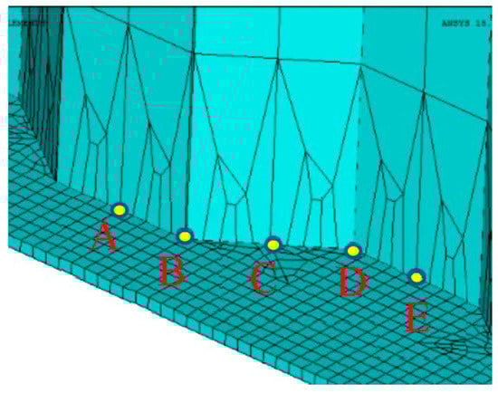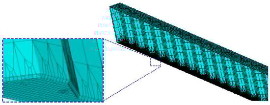 Experimental observation reported in the author’s previous study [] indicated that fatigue cracks are likely to initiate at the end of the inclined fold intersecting with the transition curvature of the trapezoidal web, as shown in Figure 2. Only the connection detail of the girder is isolated for the concern of fatigue. To further the understanding of dynamic behaviour, a finite element model was developed for the girder with trapezoidal profiled web in same configuration and geometry as shown in Figure 1. The surfaces related to the flanges and the web were merged together that share edges. The element sizes of 2 cm, 5 cm, 15 cm, and 30 cm corresponding 1/45, 1/18, 1/6, and 1/3 of the wavelength, respectively were adopted to study the mesh sensitivity and to calibrate the accuracy of the numerical results. Although the model with 30 mm element size slightly overestimates the stress variation at the transition curvature of the corrugation, using the mesh sizes of 2 cm and 5 cm give a similar and very good estimation of stress distribution as calibrated against the test results reported in Ref. []. Accordingly, fine meshes (approximate element size of 5 cm) are adopted for the adjacent regions of the welded connection between the web and the flange on the tension flange while relatively coarse meshes are adopted for the rest regions as shown in Figure 3. The element used for the modelling was chosen from the ANSYS element library as Shell 181 elements, which have four nodes with six degrees of freedom at each node. The steel material models are defined in the modelling according to the test data as listed in Table 1; the elastic modulus and the Poisson’s ratio are taken as Es = 206,000 MPa and υ = 0.3 respectively.