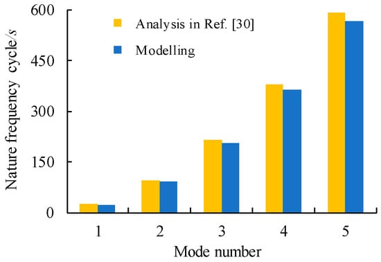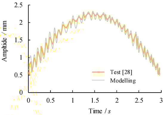 Unlike full-scale bridge structures where the dynamic properties of constituent components are inherently varied with the construction deficiencies and adverse environmental factors, a relatively small-scale beam specimen is desired for the sake of finite element model calibration since the errors caused by these effects may be somehow excluded. For the above-mentioned reason, modelling of a simply support small-scale beam excited under moving load reported in [] allows verifying the correlation of modelling and experimental natural frequencies and dynamic amplitude. The moving load travelled at uniform speed over the beam span from the starting point of 7 cm to the end point of 72 cm from global coordinates centre at end support. The moving load is applied by implementation of a carriage with negligible sliding in contact with the beam and minimum attached area. The parameters of the moving loads are taken as the load magnitude of 39.24 N and uniform load travel speed of 0.2 m/s. The beam was simply supported at the ends with rolling support on one side end and pinned at the other side. In the reported test in Ref. [], the nature frequency was measured in cycles per second with units of Hertz and the dynamic acceleration of a physical device as a voltage was measured using an accelerometer. The resultant natural frequencies and vibration of the simply supported beam are plotted in Figure 5 and Figure 6 respectively. The natural frequencies were also found by analyses which were done by finite element analysis software ANSYS 15.0 software (ANSYS Inc. Canonsburg, WA, USA). Through adding instantaneous excitation along the beam, the model has been solved using embedding algorithm of governing equation related to the mode shapes and eigenfrequencies. The modelling natural frequency and mode amplitudes of the model are also summarised in Figure 5 and Figure 6. The adequacy of the developed model is verified against test data and their related curve as the evidence of a good agreement in plotted comparison.