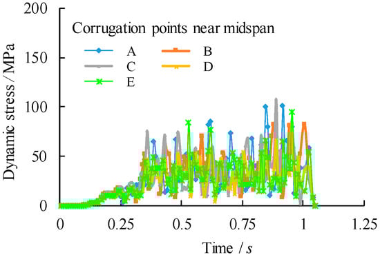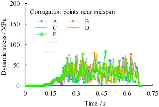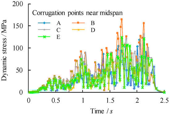 To compare the stress states at the midspan, five corrugation characteristic points are chosen within a half wave length away from the midspan centreline as from point A to point E, in which the points B and D are intersection points, the points A and E are middle points of the longitudinal fold and the point C is the middle point of the inclined fold, as shown in Figure 10. Their corresponding von Mises stress distributions are shown in Figure 11, Figure 12 and Figure 13. It can be observed that the dynamic stress is low as the front wheel load is applied on the girder and subsequently increased until the rear wheel load approaching the end of the support. The magnitude of the stresses at point B is as high as equivalent to these at the midspan of the girder although there is a location difference with a quarter wave length of the trapezoidal web. For the vehicle travel speed of v = 40 km/h, there is a notable variation of the stress distribution with the maximum stress at 1.72 s. In contrast, such a variation of peak stress becomes gradual as the vehicle travel speeds are increased to v = 90 km/h and 140 km/h. As a further examination, the stress distribution of the point B is plotted against the normalized moving position away from the origin with respect to the span of the girder (x/l0), as shown in Figure 14. It is evident that the increase in vehicle travel speed has a limited effect on the increase in peak stress. This can be explained as the load passing through the girder in a very short time so that the local connecting part of the structure is less stressed.