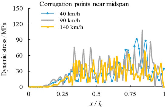 Comparison of dynamic stress distribution of the corrugation near midspan centreline (v = 140 km/h).