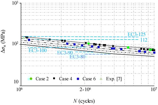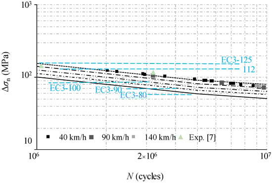 Substituting the dynamic stress results from finite element modelling as Δσ in Equation (10), the fatigue life can be predicted by substituting Equation (10) into Equation (9) and using logarithmic transformation. When plotted on log–log scales, the relationship between alternating dynamic stress and the predicted fatigue life can be described in Figure 18 and Figure 19. Based on the fatigue test results, a constant value of m = 3 is used for a comparison with the fatigue detail categories in the design code of EN 1993-1-9 []. In this code, the specified details are given not for trapezoidal profiled webs but for girders with flat webs in detail categories of 112 or 125, and for girders with welded transverse stiffeners in the detail category of 80. Additionally, the fatigue experiment results from reference [] are plotted together with analytical fatigue life versus stress range on log–log scales. It can be observed that the general trend of prediction data is very close to the experimental data of the standard loading case. The fatigue life data are very close and stable, approaching the detail category of 100 as the vehicle travel speed is increased from 90 km/h to 140 km/h. In practice, this justifies the restriction of the vehicle travel speed to no more than 80 km/h, as required by the road administration for the exemplary bridge case. On the other hand, the predicted fatigue life for the specimen under loading case 4, when compared to the loading case 2, is decreased slightly to the detail category 110. In contrast, such a decrease for loading case 6 is greatly amplified to the detail category of 90 which is just slightly higher than the detail category for welded transverse stiffeners. In this context, the girder suffers from more than twice the vehicle weight limits of a four-axle truck (i.e., 31 tons gross vehicle weight) required by the road administration for the exemplary bridge case. This indicates that the fatigue life of the bridge girders with trapezoidal profiled webs is more likely to decrease along with the stress concentration induced by the overload vehicle. Therefore, the limitation of the maximum required load of the vehicle is recommended for the maintenance of such bridge girders with trapezoidal profile webs. It is noted that above results of the analysis related to the crack initiation are based on a fracture mechanics approach, so further study is required for the service life assessment of the bridge when the desired level of performance or functionality is concerned.