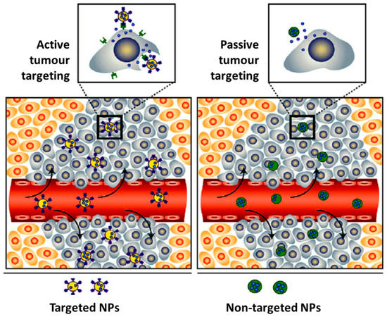 Illustration of the accumulation of nanoparticles in tumour tissues: passive vs active targeting. Adapted from Mahmoudi et al. (2011) [18].