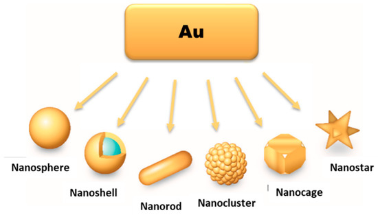 For biomedical applications, namely for cancer imaging and therapy, AuNPs offer the possibility of a versatile functionalization with targeting biomolecules for specific accumulation in tumour tissues, allowing more precise diagnostics and/or localized therapeutic effects. Moreover, there are currently available different methods to manipulate the size and shape of gold nanoparticles, spanning from shapes like nanospheres (or nanoshells), nanorods, nanocages to nanostars (Figure 2), to obtain AuNPs tailored to the different biomedical uses [19,20].