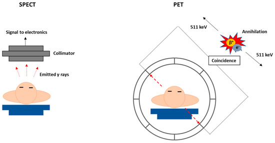 Radionuclides useful for imaging emit either γ-photons or positrons and their optimal half-life is generally going from some minutes to few hours, as can be seen in Table 1. SPECT imaging involves the detection of γ-photons in a gamma camera placed outside the patient, which are emitted directly by the radionuclide with an energy typically in the range 100–250 keV. PET imaging is based on the detection of back-to-back 511 keV annihilation photons that result from the interaction of the positrons emitted by the radionuclide with electrons from the surrounding medium (Figure 3) [24,25].