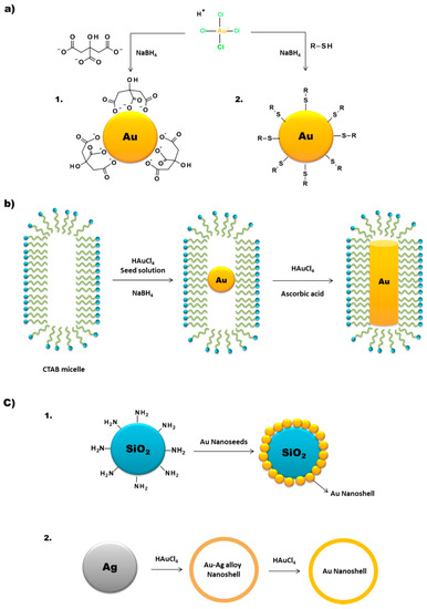 Gold nanoshells (AuNSs) can be of two types, namely solid or with a hollow core (Figure 4c). The synthesis of core-containing AuNSs is based on the use of a seed nanoparticle, which will form the core of the nanoshell. Then, the addition of tetrachloroauric acid in the presence of a reducing agent leads to the deposition of gold seeds on the surface of the core. SiO2 is one of the most commonly used cores. These silica nanoparticles have a capping agent on their surface, like 3-aminopropyltriethoxysilane (APTES), which provides NH2 groups that can link to the gold [44].