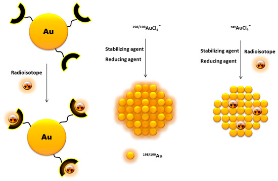 Another way to incorporate radionuclides into the AuNP structure, without their further chemical functionalization, is by directly introducing the radioisotopes in the nanoparticle core (Figure 5). This is commonly achieved by using a 198/199Au precursor in the synthesis of the nanoparticles [56,57]. Alternatively, it has also been reported the neutron irradiation of non-radioactive AuNPs to originate 198/199Au-containing nanoparticles through neutron capture reactions (197Au(n,γ)198Au and 198Au(n,γ)199Au) [58].