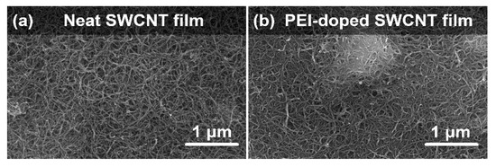 SEM micrographs of (a) neat and (b) PEI-doped SWCNT free-standing films.