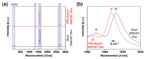 (a) Full Raman spectra of neat and PEI-doped SWCNT free-standing films; (b) close-up view on the G peak area.