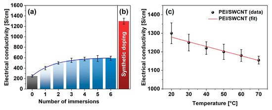 To validate the reasonableness of the proposed approach, a blank experiment was carried out wherein a neat SWCNT film was consecutively doped with PEI solution for 10 min. The sample was dried afterward, its electrical conductivity was established, and then the film was subjected to the subsequent treatment. In total, the films were put through six immersion-drying-measurement cycles (Figure 4a). In the beginning, the SWCNT film had an electrical conductivity of 249 ± 21 S/cm (on par with previous results [36]), but the exposure to PEI solution gradually increased the conductivity at an exponential pace. After six doping routines, the electrical conductivity of the SWCNT films eventually reached 593 ± 21 S/cm. Therefore, the classical doping approach boosted the electrical conductivity of the SWCNT films noticeably. An enhancement by 138% was observed after such processing.