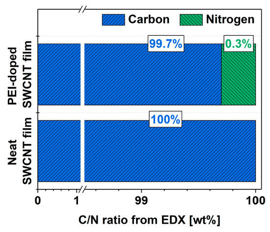 Finally, the goal was to determine the amount of nitrogen that caused the favorable modulation of the electrical properties of the SWCNT network. EDX was employed to determine the elemental composition of the material before and after doping with PEI (Figure 5). The results are presented as ratios of intensities of the integrated features relating to carbon and nitrogen in the spectra (at.%). In the neat SWCNT films, no nitrogen was detected, which could have originated from the synthesis, a proprietary technique undisclosed by the manufacturer. On the other hand, the doping process resulted in the detection of nitrogen in the material. The notable improvement to the electrical conductivity of the SWCNT films resulted from the incorporation of nitrogen at such a low level as 0.3% (concerning the total carbon content coming from both SWCNTs and the PEI itself). To put this in perspective, the interaction of 1 nitrogen atom from PEI per ca. 330 carbon atoms was sufficient to cause a favorable effect.