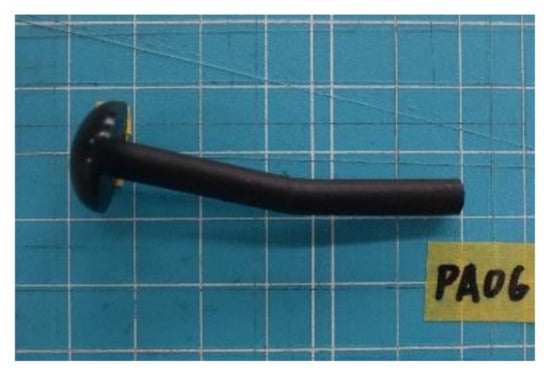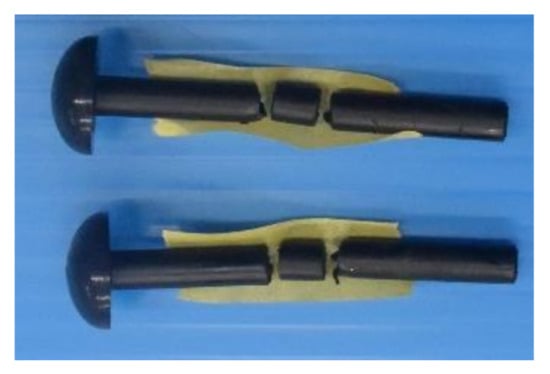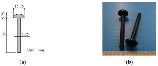 Figure 1 shows the geometry and image of the FRTP rivets used in this study. The FRTP rivets were made of polyamide 6 (PA6) with 50 wt.% glass fiber (Durethan BKV50HEF 900,116 DUS022, Tokyo, Japan) by injection molding. The length of the glass fiber was approximately 0.35 mm. Table 1 shows the properties of the FRTP material.