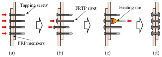 Connection method. (a) Tentative connection by tapping screw to produce holes and fix fiber-reinforced plastic (FRP) members; (b) ejecting tapping screw and inserting FRTP rivets; (c) thermoforming rivet head; (d) completed FRTP connection.