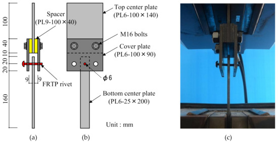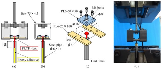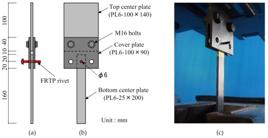 Figure 6 shows the material tensile shear test method and setup. Total number of specimens for material tensile shear test was 10. Shear force was applied to the FRTP rivet through steel plates. The top center plate and cover plates were fixed by high-strength bolts. The FRTP rivet was inserted into a 6 mm hole of cover plates and bottom center plate to apply shear load without bending.