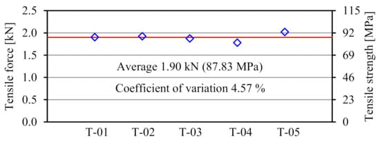 Figure 4 shows the failure mode of the FRTP rivet under tensile loading. Material tensile breaking occurred at the corner between rivet head and shank in all specimens. Figure 5 shows the tensile forces, average value, and coefficient of variation obtained by the material tensile test. The tensile strength of the right vertical axis was obtained by dividing the tensile force of the left vertical axis by the cross-section area of the rivet shank with an outer diameter of 5.25 mm. The tensile strength of the FRTP rivet was evaluated to be approximately 69% of the nominal tensile strength of the material at wet condition, as shown in Table 1. This is because stress concentration occurred due to rapid cross-sectional changing at the corner between rivet head and shank. Stable tensile strength of the FRTP rivet is demonstrated because of the small coefficient of variation.