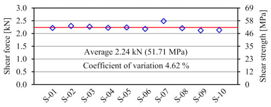 Figure 7 shows the failure mode of FRTP rivet under shear loading. Material shear breaking occurred at the boundaries between steel plates in all specimens. Figure 8 shows the shear forces, average value, and coefficient of variation obtained by the material tensile shear test. The shear strength of the right vertical axis was obtained by dividing the shear force of the left vertical axis by twice the cross-section area of the rivet shank, because shear force was applied to two cross-sections of the rivet shank. The stable shear strength of the FRTP rivet is demonstrated because of the small coefficient of variation.