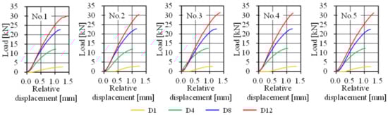 As a result of the connection test, the shear failure of the FRTP rivets was obtained in all specimens, as shown in Figure 13a. Figure 14a shows the maximal loading, average values, and standard deviation obtained by the connection test. Average strength obtained by the D1 specimens was 2.72 kN, which was 21% higher than the average of the material test result. This is because a slight bending moment was applied due to the clearance between cover plate and rivet in the material shear test, but only shear force could be applied in the connection test by the non-clearance connection method shown in Figure 2. Figure 13b shows a close-up image of around the FRTP rivet of the broken specimen. Since the nominal outer diameter of the tapping screw was 5.5 mm, the clearance between FRTP rivet and GFRP plate was theoretically 0.25 mm. In fact, Figure 13b confirms that the clearance was very small. The connection using FRTP rivets could provide quite stable strength because of the small coefficient of variation regardless of the number of rivets. Figure 14b shows the maximal loading per unit rivet. Maximal loading per unit rivet was calculated by the maximal loading shown in Figure 14a divided by the number of rivets used for the connection. Even if the number of rivets increased, the connection strength per unit rivet was almost the same. Moreover, the connection strength per unit rivets was higher than the shear strength of material test was. Therefore, connection strength using FRTP rivets linearly increased as the number of rivets increased. Figure 15 shows the load-relative displacement relations. Initial sliding was not observed in all specimens using multiple rivets because non-clearance could be achieved, as shown in Figure 13b.