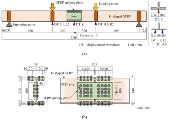 Figure 16b shows the joint details. The number of rivets in width, height, and longitudinal direction were four, four, and eight, respectively. Thus, the total number of rivets used for joining was 96. The total number of rivets was determined so that the rivet fracture preceded the beam member fracture and buckling to evaluate the strength of the FRTP rivet connection. The bending test was performed on only one specimen, but bending test behaviors were expected to be stable because connection strength using FRTP rivets was stable, as shown in Section 4.