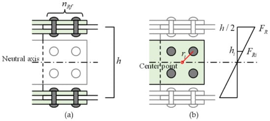 where is distance from the center of gravity of web joint to one rivet; and is the shear force resisted by the rivet, which was calculated by multiplying the shear force of FRTP rivets by the ratio of the vertical distance of rivet to the vertical distance of center of flange based on the beam neutral axis. Therefore, maximal loading at the joint was calculated using the bending moments obtained from the Equations (2) and (3) by the following equation.