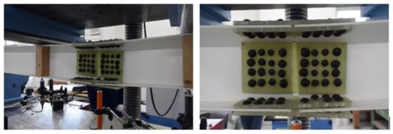 This section discusses the strength of the beam joint using FRTP rivets for a GFRP beam through a four-point bending test. Figure 16 and Figure 17 show bending test specimen and setup, respectively. The specimen was produced with longitudinally jointed two H-shaped GFRP beams with a 5 mm gap using FRTP rivets through GFRP splice plates. The H-shaped GFRP beam member consisted of two pultruded GFRP channel-shaped members that were adhesively bonded back-to-back by epoxy adhesive. The mechanical properties of the GFRP channel-shaped member are shown in Table 2. The GFRP splicing plates were molded by vacuum-assisted resin transfer molding using two-directional glass woven fabric (ERW580-554A) and epoxy resin.