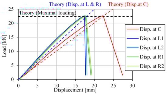 Theoretical displacements obtained by the Equations (13) and (14) are also represented in Figure 18. They were in good agreement with the displacements obtained by bending test at maximal loading; errors were 1.1% at the middle of span and 2.9% at the loading points. Therefore, displacement at maximal loading could be accurately evaluated by considering displacement due to rotation at the joint in addition to displacement due to bending and shear. Displacement during loading could not be perfectly simulated because the obtained displacement from the bending test increased nonlinearly with the load. However, theoretical displacement at the middle of span could be simulated with 15% error the experimental displacement.
