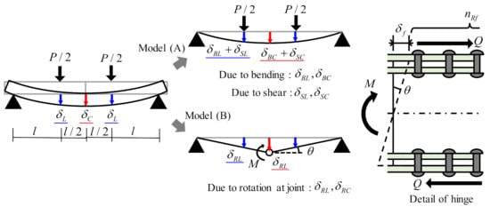 In this study, we considered three displacement components to evaluate deformation, i.e., the bending and shear deformations obtained from fundamental beam theory, and rotation at the joint as shown in Figure 21. Displacements due to bending, and were calculated by the following equations. Subscript C, middle of span; subscript L, loading points.
