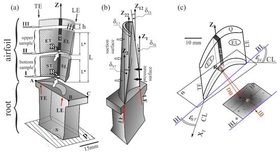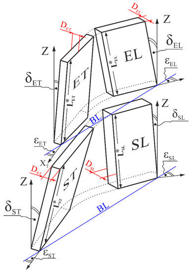 An airfoil can be divided into five areas: one area with the angle δ = 0, the two areas SL and EL (Figure 1a) (their inclination to the axis Z can be referred to as the inclination of the LE relative to Z) as well as the two areas ST and ET (Figure 1a) (their inclination can be referred to as the inclination of the TE). The area with δ = 0 is the middle area and was not considered because it is relatively narrow (Figure 1a). The areas SL and ST of the bottom sample, as well as the areas EL and ET of the upper sample, are rotated around the BL of the bottom and the upper samples by the angles ε and are inclined to the blade axis Z by their respective angles δ.