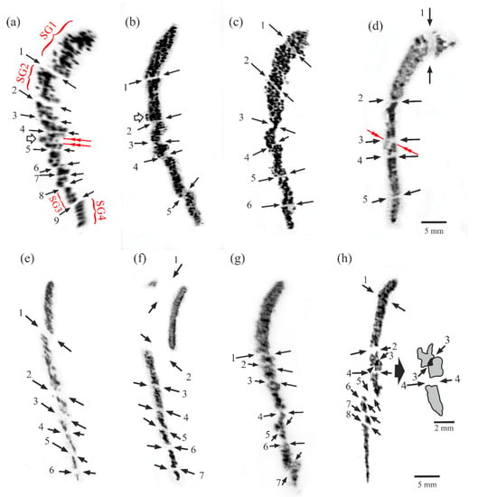 Figure 2 shows X-ray topograms obtained for airfoils of two series of blades obtained at the withdrawal rates of 2 mm/min, 3 mm/min, 4 mm/min and 5 mm/min each. The presented topograms were obtained from the surface Q of the upper sample located near the tip of the airfoil, where the crystallization of the blades was coming to an end. The topograms obtained from the cross-section III contain images of all of the LABs created during the passage of the crystallization front along the axis Z across the entire length of the blade airfoil, as well as images of LABs that were inherited by the airfoil from the root [28]. The topograms consist of the groups of contrast stripes or/and spots marked for example as SG1, SG2, SG3 and SG4 in Figure 2a. The individual contrast spots and stripes visualize the separate dendrites while the groups indicate the individual subgrains (which are SG type subgrains—see Figure 2 for further details). The mutual shift of the images of neighboring dendrites or the images of the neighboring subgrains allows for determination of the angle of their mutual misorientation, which also describes the disorientation angle of the LABs. The mutual misorientation angle calculation method is described in Ref. [34]. The misorientation angle between the single dendrites was found to be up to 0.3°, and it was higher between groups of dendrites. This criterion allowed us to identify the subgrain in nickel-based dendritic superalloys.
