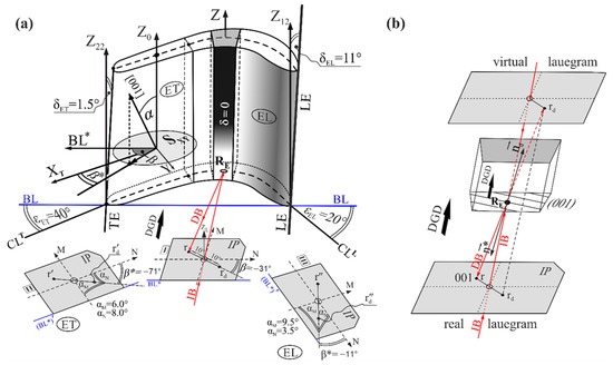 where α* is the angle between the direction [001] and the TE, and β* is the angle between the projection of the direction [001] on a certain plane (the plane is perpendicular to TE) and the axis XT (the axis is parallel to the fragment CL of the airfoil area ET) (Figure 1c). The angles could be determined using the Laue patterns of the airfoil cross-sections. The Laue patterns were obtained by arranging the baseline BL* of the image plate parallel to the baseline BL of the airfoil cross-section (Figure 1c). The primary X-ray beam was directed at the airfoil region with δ = 0. The Laue patterns were obtained from the points RS and RE (Figure 1a) of the bottom and the upper samples of each blade airfoil, respectively.