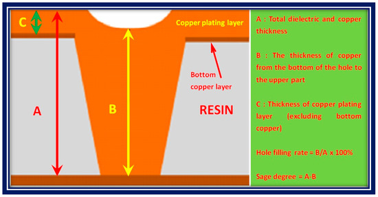 The cross section of the micro blind hole after polishing was observed using a metallographic microscope. The filling effect of the hole filling electroplating is usually characterized by the filling rate, copper thickness, and sag degree. The hole filling rate = B/A × 100% and the sag degree = A − B, where A is the surface thickness of the copper layer from the bottom of the blind hole to the surface of the plate, B is the thickness of the most concave copper layer from the hole bottom of the blind hole to the surface of the hole, and C is the thickness from the copper foil to the surface of the copper layer on the plate surface, as shown in Figure 1. According to whether the blind hole is fully filled; whether there are holes, cavities, and other defects in the hole; and whether the filling rate meets certain industry requirements, the filling effect can be judged. The sag degree should be controlled within a dozen microns. The thickness of the copper plating should be as small as possible on the premise of ensuring that the sag meets the production requirements.