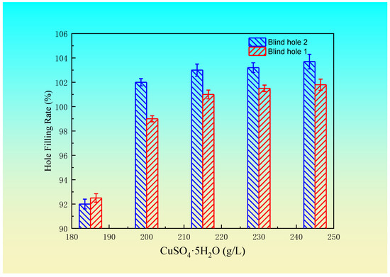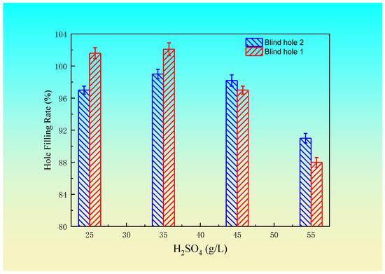 Based on the above test results, the suitable electroplating process and bath formula for a blind hole with a diameter of 100 μm and depth of 50 μm are as follows: 210~225 g/L CuSO4·5H2O concentration, 25~35 g/L H2SO4 concentration, 45~60 mg/L Cl− concentration, 0.8~1.2 mL/L brightener concentration, 10~16 mL/L leveling agent, 50~80 min electroplating time, 10~15 mL/L wetting agent concentration, and 1.4~1.7 A/dm2 current density. According to the selected plating solution formula, blind hole 1 (depth diameter ratio of 1:2), with a diameter of 100 μm and a depth of 50 μm, and blind hole 2 (depth diameter ratio of 1.17:1), with a hole diameter of 60 μm and depth of 70 μm, were each plated under different levels of various factors. The optimum concentration of sulfuric acid was obtained by fixing the H2SO4 at a concentration of 25 g/L, Cl− concentration of 45 mg/L, wetting agent concentration of 10 mL/L, brightener concentration of 1 mL/L, leveling agent of 15 mL/L, current density of 1.5 A/dm2, and electroplating time of 55 min, and changing the concentration of the copper sulfate. Then, by selecting the best concentration of copper sulfate, while the other factors remain unchanged, the best concentration of sulfuric acid could be obtained through experiments. The hole filling rate changes of the two types of holes are shown in Figure 4 and Figure 5, respectively.