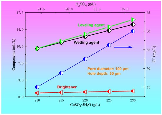 Copper sulfate is the main source of copper ions in an electroplating solution. A high copper and low acid system is usually used in electroplating hole filling. When the concentration of copper sulfate is too low, the deposition rate of copper is slow. When the concentration of copper sulfate is too high, the crystal particles increase and affect the dispersion ability of the electroplating solution. Figure 2 shows the relationship between the copper sulfate concentration and the blind hole filling effect (35 g/L H2SO4, 45 mg/L Cl−, 15 mL/L leveling agent, 1 mL/L brightener, 10 mL/L wetting agent, 1.5 A/dm2 current density, and 55 min electroplating time). It can be seen from Figure 2 that the sag decreases with the increase in the copper sulfate concentration. When the CuSO4·5H2O concentration increases from 210~225 g/L, the filling effect is good and the sag is about 0. When the concentration of CuSO4·5H2O increases to 230 g/L and above, the blind hole filling is prominent and overfilled, and CuSO4·5H2O is easy to crystallize and precipitate. On the other hand, the thickness of the copper plating on the surface is almost independent of the concentration of the copper sulfate, and the thickness of copper is between 19 and 24 μm, which indicates that the concentration of copper sulfate hardly affects the thickness of the copper in the experimental range. The results from the above experimental data show that the blind hole filling effect was good when the concentration of CuSO4·5H2O varied from 210 to 225 g/L.