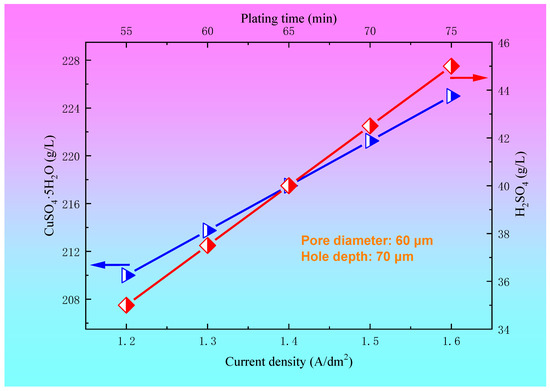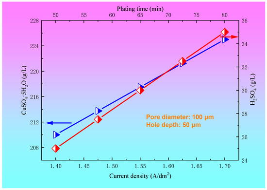 The relationships between the current density and electroplating time and the concentration of CuSO4·5H2O and H2SO4 for the blind hole with a diameter of 60 μm and a depth of 70 μm.