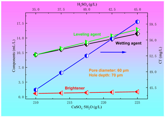 The relationships between the concentration of CuSO4·5H2O and H2SO4 and the plating solution formula for the blind hole with a diameter of 60 μm and a depth of 70 μm.