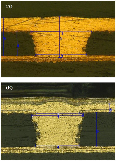 The section morphology of the micro blind hole after polishing was observed using a metallographic microscope. For a blind hole with a diameter of 100 μm and a hole depth of 50 μm, when the current density was 1.4~1.7 A/dm2 and the electroplating time was 50~80 min, the representative metallographic micrographs of the blind hole are shown in Figure 10A. For the blind hole with a diameter of 60 μm and a hole depth of 70 μm, when the current density was 1.2~1.6 A/dm2 and the electroplating time was 55~75 min, the representative metallographic micrographs of the blind hole are shown in Figure 10B. As can be seen from Figure 10, it was found that there were no holes, pores, contaminants, and delamination fractures in the blind holes, showing good filling effects.