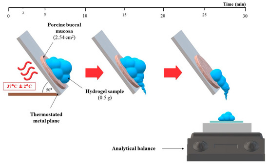 Mucoadhesive properties of hydrogels were assessed by using a self-constructed apparatus consisting of the thermostated metal surface and the analytical balance (Figure 1), according to recommendations of Sandri et al. with modifications [38,39]. 0.5 g of each hydrogel was placed on a defrosted porcine buccal mucosa (2.54 cm2 discs) at 37 °C ± 2 °C. After 3 min of thermostatting, the metal surface with the sample was set at the angle of 50°, and sample behavior was observed for the next 30 min. At the set time intervals (2, 5, 10, 15, 20, and 30 min), the mass of hydrogel which flowed down was noted. In order to provide the highest correlation of the in vitro/in vivo conditions, the carriers were mixed with SS at 1:0.25 and 1:0.5 weight ratios based on salivary flow rate [40]. Following the above procedure, the retentivity of the commercially available product was also assessed.