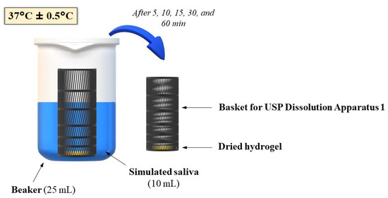 A swelling study was performed for dried hydrogels. 700 mg ± 5 mg of each formulation was placed in a plastic blister packaging with a diameter of 13 mm and dried in the oven at 40 °C for 24 h. Accurately weighted films were located in baskets for USP Dissolution Apparatus 1 [41] and immersed in 10 mL of SS at 37 °C ± 0.5 °C. At the set time intervals, baskets with films were carefully drained and weighted (Figure 2). For evaluation of the swelling capacity, the degree of swelling (α) was determined as follows: