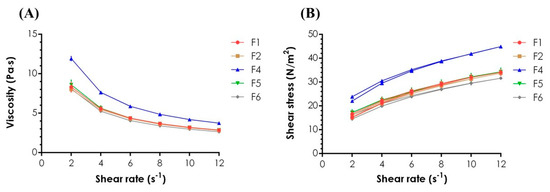 Viscosity measurements performed for undiluted hydrogels confirmed the observations made in the texture analysis, and no substantial difference between F1 and F4 viscosity values was noted. Mixing the oppositely charged polymers most probably resulted in the formation of a system consisting of PEC coacervates and polyelectrolytes-depleted polymeric matrix with correspondingly lower viscosity and mechanical strength [4]. Rheological analyses performed for the formulations after dilution with SS at 37 °C ± 0.5 °C pointed in turn out the significant influence of ions and temperature on the PECs viscosity (Figure 3A,B). While for XG/CS hydrogels developed by Martínez-Ruvalcaba et al. [44], the addition of Na+ resulted in more viscous system preparation, observations made by Mohammadifar et al. [45] on TG fractions derived from A. gossypinus pointed out the significant viscosity reduction after the dispersion of the polymer in ionic media. High-temperature tends to lower XG [46] and TG [45] viscosities; however, conformational changes in XG chains at above 36 °C lead to a more anionic character of the polymer [46] and then might be a reason for more intense PECs formation. Increasing CS concentration resulted in turn in gradual complexation of the polyions [47] and then the formation of a stoichiometric PEC with completely neutralized functional groups what led to the viscosity stabilization despite the polyanion/polycation ratio. The plots of viscosity against shear rate (Figure 3A) pointed out the non-Newtonian pseudoplastic formulations. All gels exhibited shear-thinning behavior—upon the growth of shear rate, the viscosity decreased [48]. According to the rheograms (Figure 3B), the formulations were characterized by low thixotropic properties as evidenced by minor hysteresis loops formed between the ascending and descending curves.