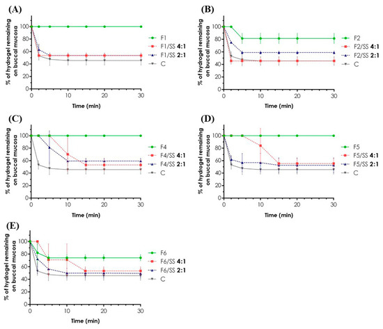 In vitro mucoadhesive properties of the carriers determined as% of a hydrogel/diluted hydrogel F1 (A), F2 (B), F4 (C), F5 (D), and F6 (E) remaining on the porcine buccal mucosa over 30 min of an experiment at 37 °C ± 2 °C. Commercially available product (C—control) was used in its undiluted form as a reference (mean ± SD, n = 3).