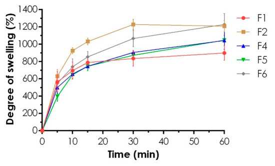 The swelling test revealed significantly higher values of the degree of swelling by 400% for F2 formulation compared to F1, as shown in Figure 5. Flattening the curves, which was noted especially for F2 after 60 min, resulted from a loss of a highly diluted sample at the stage of drying of a basket. In contrast to XG and CS with the proven water-uptake ability which slows down the polymer matrices disintegration [52], TG is subjected to erosion upon contact with water, most probably due to its chemical structure—rapidly dissolving tragacanthin/tragacanthic acid and hydrophobic bassorin with a limited swelling capacity [53]. Comparing to the very similar kinetics of swelling recorded for F4 and F5 gels, for F6, a substantial increase of saliva uptake was noted. Since any similarities in gels swelling behavior were highly correlated with the mechanical and viscosity characteristics recorded for undiluted formulations, weaker and less viscous PECs matrices (F2, F6) may be more susceptible for SS penetration and then swelling. The presence of the ionized amino groups results in their repulsion with simultaneous relaxation of the CS matrix highly susceptible to medium uptake [54]. The negligible difference in swellability of the tripolymeric formulations F4 and F5 was most probably due to the complete neutralization of CS amino groups by carboxylic acid groups of gums. However, the further increase of CS content in F6 resulted in the preparation of a non-stoichiometric PEC with an excess of free CS able to swell what was confirmed in zeta potential measurement for fifty-fold lower polymers concentrations (see Section 3.5. below). For none of the gels tested, the state of swelling equilibrium was recorded within 60 min. While the shortest rehydration time was noted for F2 (below 15 min), only F1 did not achieve the mass before the drying process within 60 min. As mentioned above, tripolymeric hydrogels maintained their initial shape forming a highly swollen matrix, whereas, in dipolymeric formulations, progressive disintegration of the membranes resulting in unwanted leakage of a sample from a basket was observed.