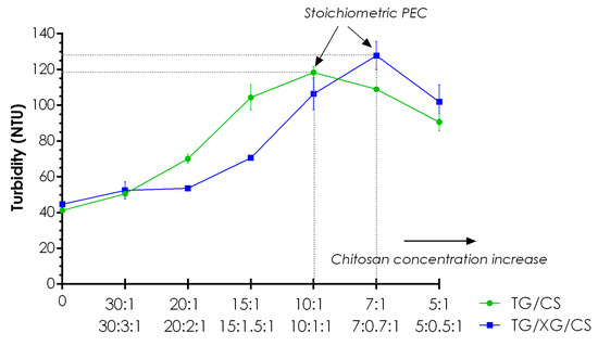 The aim of the test was to confirm the process of PECs formation between cationic CS and anionic gums under experimental conditions. Fifty-fold lower concentrations of the polymers compared to the studied hydrogels enabled visualization of the primary PECs formation by measuring the turbidity of the dispersions obtained. Di-and tripolymeric complexes revealed a similar tendency of turbidity changes upon CS concentration increase (Figure 6); however, the addition of XG affected the formation of noticeably greater particles. Furthermore, for the tripolymeric complexes, characteristic displacement of the plot toward higher CS concentrations was observed what may be explained by the different ability of light scattering reduced by the effect of light absorption by tripolymeric precipitates. The polymer ratios for which the highest turbidity values were recorded may be considered as the points of stoichiometric PEC formation in which all negatively charged carboxylic acid groups of gums became electrostatically bonded to positively charged amino groups of CS what resulted in precipitation of the largest amount of PEC [43]. For dipolymeric mixtures, the highest turbidity was noted for the sample with a ten-fold higher concentration of TG than CS, while for tripolymeric formulations, TG/XG/CS 7:0.7:1 showed the maximum turbidity. Partial correlation of the results for tripolymeric complexes with zeta potential values presented in Section 3.5. may arise from the most intense electrostatic interaction between TG and CS at the missed ratio between 10:1 and 7:1. After the point of stoichiometric PEC formation, excess of charged CS probably determined the repulsion of cationic amino groups of the polymer leading to PEC destabilization with the weaker ability of light scattering.