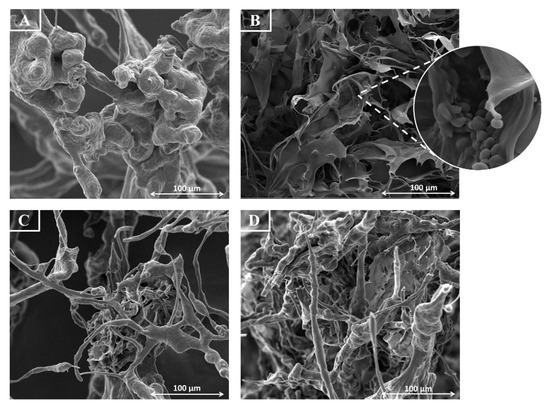 SEM analysis distinguished two morphologically different PECs systems. Freeze-drying of the dispersions resulted in the formation of the sponge-like structure with aggregates of PECs particles shaped in the homogenization process. Comparing to the relatively homogenous dipolymeric matrix (Figure 7A,B), the addition of XG affected a binary character of the lyophilizate—thin “filaments” of TG/CS PECs were surrounded by the highly branched structure of XG/CS and/or TG/XG/CS PECs (Figure 7C,D).