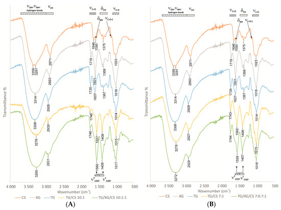 FTIR spectra of CS, TG, XG, di- (TG/CS 10:1 and TG/CS 7:1) and tripolymeric complexes (TG/XG/CS 10:1:1 and TG/XG/CS 7:1:1) (A,B) with different polymer ratios.