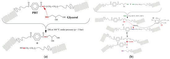 (a) Alcoholysis reactions of PBT in the presence of glycerol, (b) transesterification reactions of PBT with glycerol in the presence of Zn(acac)2 during the solid state polymerization step of the process.