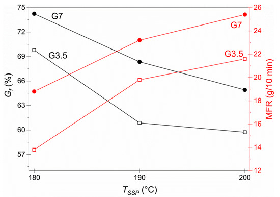 Highest crosslinking extent (Gf) and highest melt strength (MFR) of the produced vitrimers G3.5 and G7 as a function of solid-state polymerization (SSP) temperature (180 °C, 190 °C and 200 °C) after 3 h of reaction.
