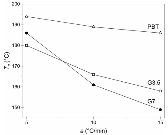 Despite the recent exciting advances on vitrimers synthesis, no study has been done up to now on their melt crystallization behavior. Poor control of crystallization during the subsequent (re)processing may lead to widely varying mechanical properties and dimensional variations. For example, an injection molding plastic that is partially crystallized or forms a thermodynamically unstable intermediate may undergo further crystallization in secondary processing, storage and transport or even end-use, altering the physical properties of the material [16,24,26]. Therefore, it is essential to investigate the potential influence of the dynamic crosslinked network upon the crystallization behavior and, consequently, the final properties of PBT-based vitrimers. In this perspective, the neat PBT and the vitrimers G3.5 and G7 submitted at the optimum SSP temperature (180 °C) were studied regarding the non-isothermal melt crystallization. Data for the crystallization temperature Tc as a function of the cooling rate a (5 °C/min, 10 °C/min and 15 °C/min) were obtained and depicted in Figure 3.